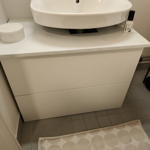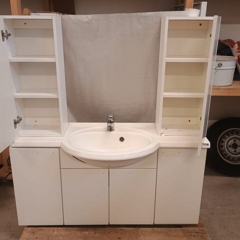 Kylpyhuoneen allaskaappi, hana ja peilikaappi. Allaskaapissa on valkoinen pesuallas ja kahdella vetolaatikolla varustettu runko puunsävyisellä etupinnalla. Peilikaapissa on useita hyllyjä pientavaroiden säilytykseen. Sopii kylpyhuoneeseen tai wc-tilaan lisäsäilytystilaksi ja pesualtaan kalustukseksi.