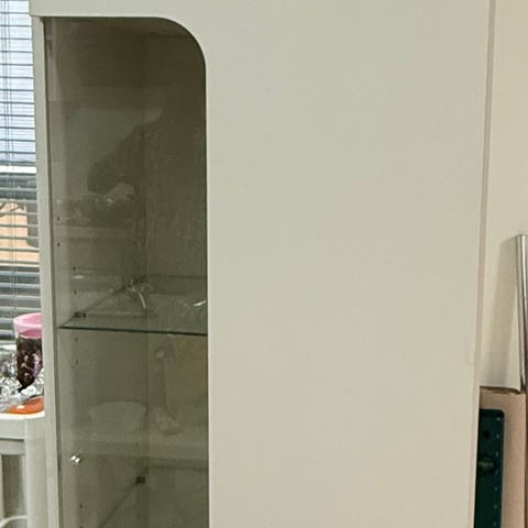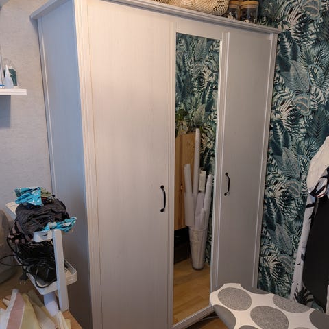 Valkoinen korkea kaapisto, jossa useita ovellisia kaappeja ja vetolaatikoita. Kaapistossa on säädettäviä hyllyjä ja yläkaappi ylös avautuvalla mekanismilla. Vetimet ovat puunväriset. Sopii esimerkiksi eteiseen, kodinhoitohuoneeseen tai muuhun säilytystilaa tarvitsevaan tilaan.