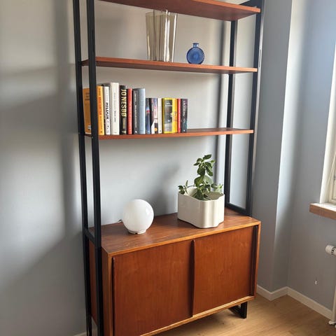 Olof Ottelin, 1960-luvun Formula-kirjahylly ja senkki Oy Stockmann Ab:lle. Erillinen senkki ja hylly, voi käyttää sellaisenaan tai päällekäin, eikä ruuvin jälkiä ole.