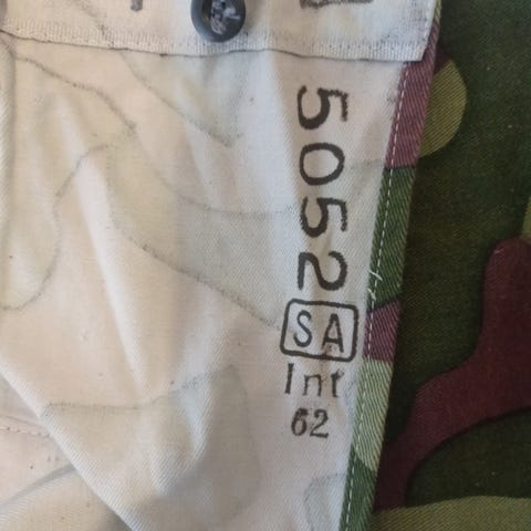 Suomen armeijan alkuperäinen M62-maastopuvun takki, valmistettu Valtion Pukutehtaalla vuonna 1971.
