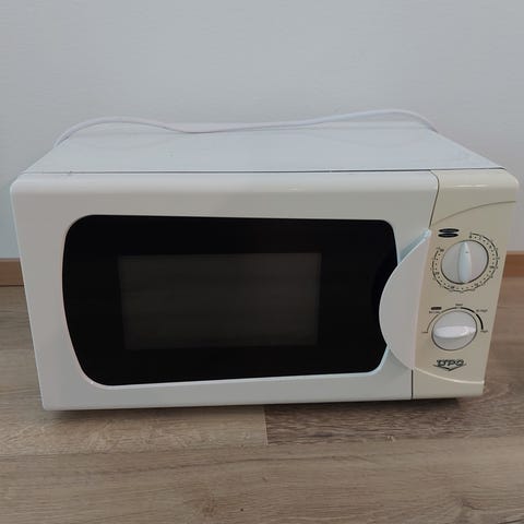 Muutoin vielä aivan hyvin pelaava mikro, mutta tarvitsee uuden pienen säteilylevyn. Tämänhetkinen vauroitunut. Näitä saa monista elektroniikka kaupoista ostettua. Voi ottaa tämän vaurioituneen levyn mukaansa, jos haluaa sillä varmistaa koon :) mikrokupu ja lautanen tulevat mukaan.