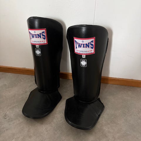 Twins Special säärisuojat kamppailulajeihin. Koko S, unisex-mitoitus. Väri musta. Suojissa on jalkapöydän suoja sekä tarrakiinnitykset takana istuvuuden säätöön. Soveltuvat esimerkiksi potku- ja kamppailulajien harjoitteluun, joissa tarvitaan säärien ja jalkapöytien perussuojaa. Kuvat eivät näytä kunnolla todellista kuntoa, suojat ovat täysin ehjät.
