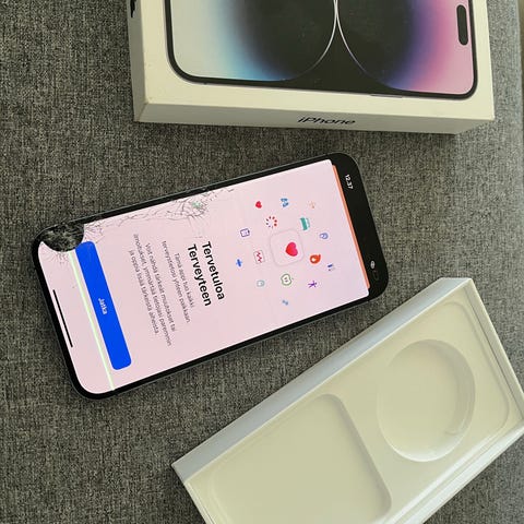 14 Pro Max jossa takalasi ja kamera säröillä, tämä huomioitu hinnassa. Näytössä pieniä hiusnaarmuja jotka eivät näy tavallisessa käytössä. Muuten toimiva ja hyvä puhelin, mutta säröjen takia kamera ei tarkenna.