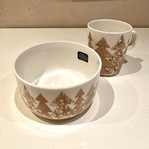 Musta-valkoinen. Muki 2,5 dl ja kulho 5 dl. Hinta yhteensä 40,00 euroa.