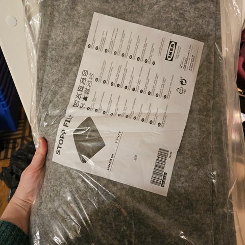 Valkoinen liukuesteverkko rullalla. Materiaali on harvaa, ruudullista verkkoa, joka läpäisee hyvin valoa ja ilmaa. Liukuesteverkko auttaa mattoja pysymään paikoillaan arjen tiimellyksessä. Liukuesteverkko voidaan leikata haluttuun kokoonMyydään rullina, kuvissa näkyy kaksi rullaa ja levitettynä tuolin päällä mittasuhteiden havainnollistamiseksi.