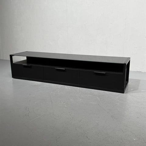Moderni TV-taso, jossa on kaksi mustaa vetolaatikkoa ja keskellä avoin tila lasihyllyllä. Taso on selkeälinjainen ja käytännöllinen. Sopii hyvin monenlaiseen sisustukseen. Taso on hyvässä kunnossa, mutta siinä on pieniä käytön jälkiä. Laatikot toimivat moitteettomasti, ja avoin tila tarjoaa lisätilaa medialaitteille.