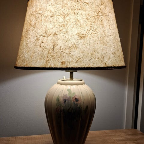 Vanha pöytälamppu. Korkeus varjostimen kanssa noin 66cm. Sähköt tarkastettu, uudenmallinen pistotulppa ja toimivuus testattu. E27 kanta. Isokokoinen vaaleasävyinen varjostin - siisti. Keraaminen vaasi keltaisin ja oranssinsävyisillä maalauksilla. Tämän voisi kokonsa puolesta laittaa joko pöytätasolle tai lattialle. Polttimo ei kuulu hintaan.