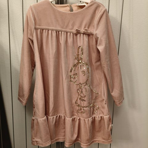 Uusi, käyttämätön muumimekko kokoa 104. Laput kiinni. Kuosi Kirsikankukka. Taskut molemmin puolin edessä, pitkät hihat.