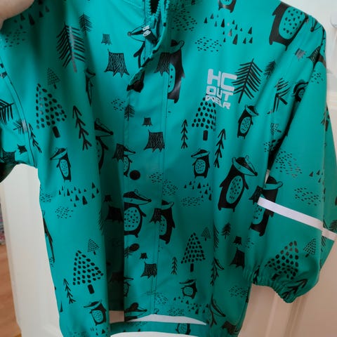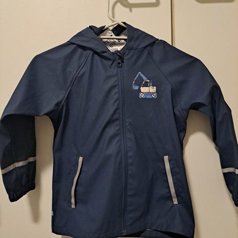 Punainen, pilkullinen sadetakki. Hupussa ja kauluksessa fleece -vuori. Vetoketju ja tarrakiinnitys. Todella siisti kunto. Nimi merkattu tussilla lappuun.