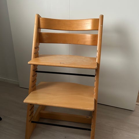 Stokke Tripp Trapp syöttötuoli musta. Säädettävä istuin- ja jalkataso, jotka voidaan asettaa eri korkeuksille ja syvyyksille lapsen koon mukaan. Valmistettu puusta. Tuolissa on klassinen Tripp Trapp -rakenne, joka sopii käytettäväksi ruokapöydän ääressä. Kuvissa näkyy käytön jälkiä ja kulumia maalipinnassa.