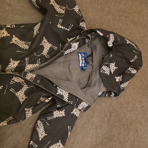 Myydään meille pieneksi jäänyt Jonathanin sadahaalari kokoa 98cm. Haalari ehjä! Takana haaleaa tummentumaa ja toisen lahkeen heijastin repsottaa.