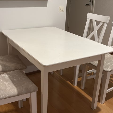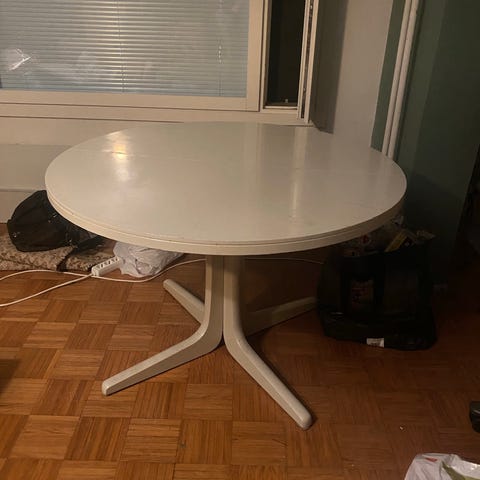 Annetaan olohuoneen pöytä, korkeus 47cm ja halkaisija 90cm. Jalat notkuu, yhdestä jalasta puuttuu ruuvi ja jalka on irronnut useamman kerran.