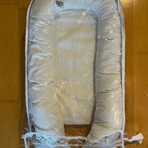 Harmaa vauvapesä, jossa pehmeä reunus ja irrotettava pohjatyyny. Jalkopäässä on säädettävä solkikiinnitys, jonka avulla pesän kokoa voi muokata vauvan mukaan.