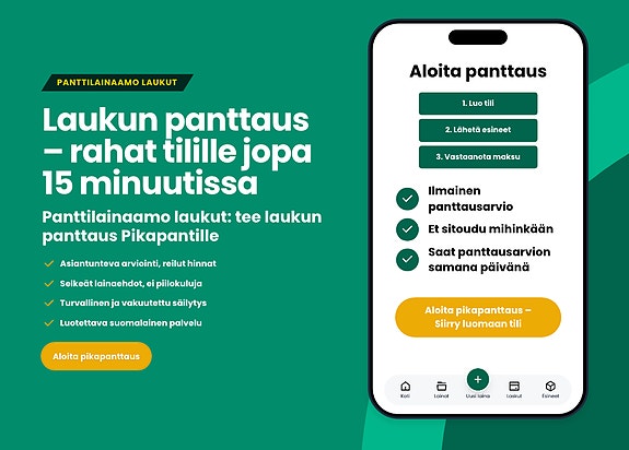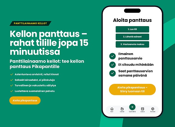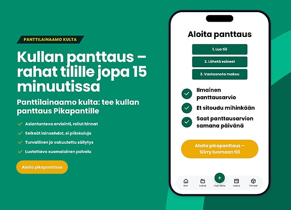 Pikapantti on kotimainen panttilainaamo, joka tarjoaa selkeät sopimusehdot ja kilpailukykyisen lainasumman esineesi arvoa vastaan. Arvioimme kellot, korut, laukun, kullan ja muut arvoesineet ammattitaidolla.