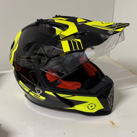 LS2 Pioneer moottoripyöräkypärä. Malli on offroad-/adventure-tyyppinen kypärä, jossa on kypärälippa ja kirkas visiiri. Väritys on musta–keltainen graafisilla kuvioilla, sisusta punasävyinen. Kypärässä on leukasuoja, ilmanvaihtoaukkoja ja mikrolukitus hihnassa. Moottoripyörä-, mopo-, crossi-, moottorikelkkailu.