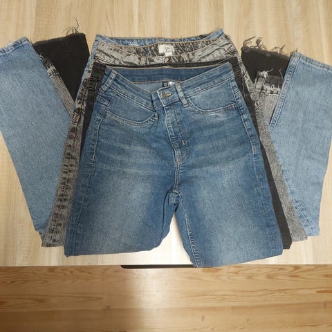 Kolmet farkut suurinpiirtein samaa kokoa kaikki. Lee farkut vetoketjulla ja joustolla, kahdessa muussa sepaluksessa nappikiinnitys.