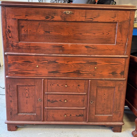 Puinen kirjoituspöytä, jossa vihreä nahkakansi ja useita vetolaatikoita molemmin puolin sekä keskellä. Pöydässä on koristeelliset jalat ja kehykset sekä metallivetimet laatikoissa. Sopii työpöydäksi tai kirjoituspöydäksi esimerkiksi työhuoneeseen tai olohuoneeseen. Käyttökelpoinen mutta päällisin ouolin kaipaa fixausta