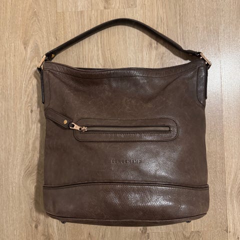 Longchamp nahkalaukku naisille. Laukku on ruskeaa nahkaa, jossa pehmeä, mokkamainen pinta ja tummemmat nahkaiset olkahihnat. Laukun etupuolella on vetoketjutasku ja laskostettu etutasku metalliniiteillä. Sisäpuolella on vaalea, logokuvioitu vuori sekä lisälenkkejä ja metalliosia kiinnitystä varten. Sopii arkilaukuksi ja mukaan päivittäisiin menoihin, kun tarvitaan tilava olkalaukku henkilökohtaisille tavaroille.