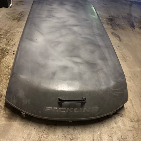 Kattoboksi, väri valkoinen. Sopii auton katolle lisäsäilytystilaksi esimerkiksi matkatavaroille tai varusteille. Boksissa P3 Group ja P3 Communications -logot kyljissä ja päällä. Materiaali vaikuttaa olevan kova muovi tai vastaava komposiitti.