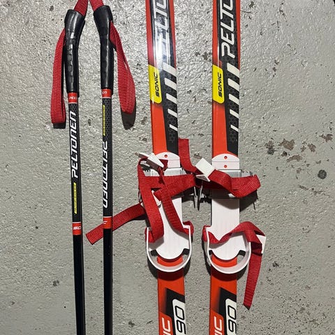 Ensimmäisiin hiihtoihin kenkiin kiinnitettävät sukset 90cm, ja sauvat 75cm. Vain nouto.