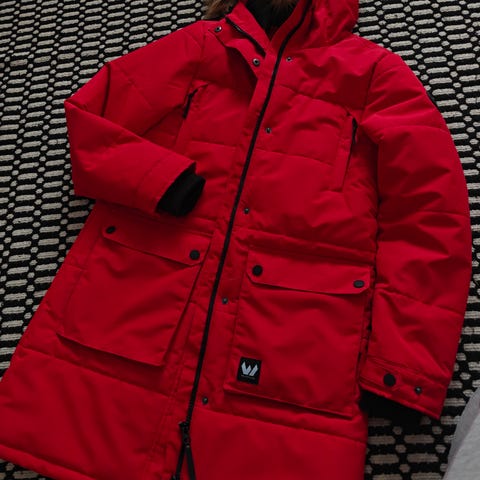 Pitkä uudenveroinen toppatakki, vähän käytetty. Kaikai 60 cm.