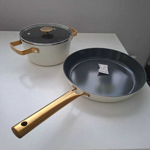 N. 3 l kattila, n. 5 l kattila, paistokasari kannella ja paistinpannu. Ei induktio. Siitä perussetti kerralla. Teflonia ja terästä.