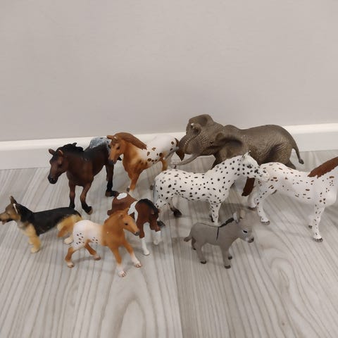 Schleich sarjan eläimiä, suurin osa hevosia. Olleet leikeissä eli jonkin verran leikinjälkeä löytyy. Gepardin pentu täysin uusi. 40e yhteensä eli alle 5e per eläin. Nouto Ritaharjusta tai postitus toridiilillä.