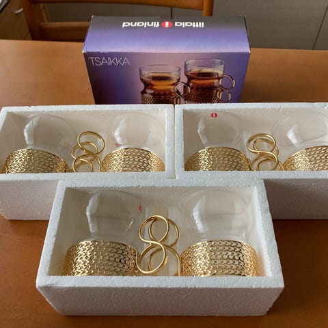 Timo Sarpanevan Iittalalle suunnittelemat Tsaikka 23 cl kuumajuomalasit metallipidikkeillä.