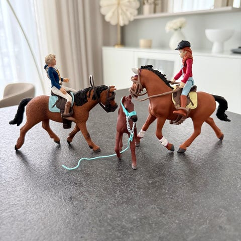 Schleich hevoshahmot ja ratsastajahahmo leikkisetti. Settiin kuuluu kaksi ruskea-valkoista hevoshahmoa sekä ihmishahmo, jolla on punainen paita, siniset housut ja mustat saappaat. Hahmot sopivat esimerkiksi maatila- ja hevosleikkeihin sekä kokoelmiin. Muoviset figuurit ovat pienikokoisia ja yhteensopivia muiden Schleich-eläinhahmojen kanssa.