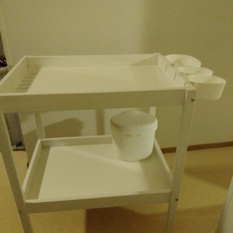 IKEA hoitopöytä integroidulla vauvanammeella. Hoitotaso on pehmustettu ja siinä on kuviollinen, pyyhittävä pinta. Runko on metallia ja taittuu kasaan säilytystä varten. Hoitotason alla on irrotettava valkoinen muovinen vauvan amme, jossa on muotoilu vauvan tukemista varten sekä pieniä lokeroita pesutarvikkeille. Soveltuu vauvan hoitoon ja kylvetykseen kotikäytössä.