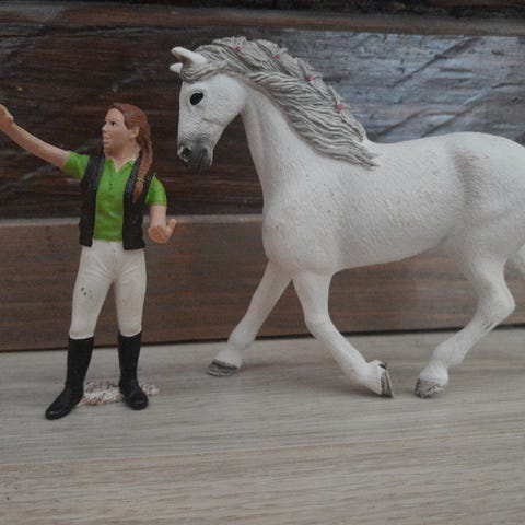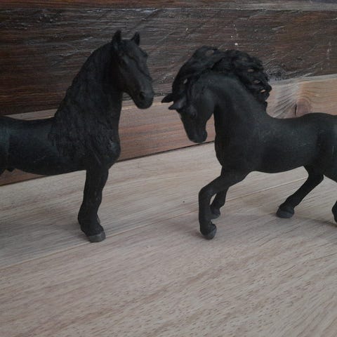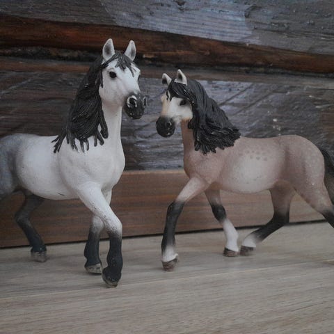 Schleich hevosfiguurit. Kaksi valkoista muovista hevoshahmoa, joissa harmaa harja ja häntä, toisessa harjassa koristeellisia kukkia. Sopivat leikkeihin, kokoelmiin tai dioraamoihin. Muovimateriaali, yksityiskohtainen muotoilu ja maalipinta.