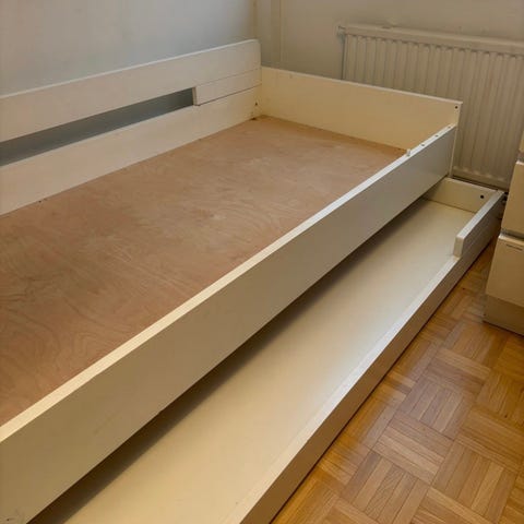 Myydään kuvan monitoimisänky. Kokonaisuuteen kuuluu kirjahylly, kaappi, pöytä ja sänky. Pöydän voi työntää sängyn alle. Ollut kahdella käytössä. Jonkin verran kulumaa. Kaapin laatikostosta puuttuu vetonupit. Ylin laatikko ollut lukittavissa. Lukko hajonnut ja en tiedä onko avain enää tallessa. Sänkyyn menee patja 80 X 200 cm. Sälepohja. Kunnostamalla saa vielä hyvän kokonaisuuden. Ei mahdu henkilöautoon. Sänky on käytössä kunnes myydään. Patja ei kuulu kauppaan.