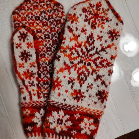 Myydään uudet, käsinneulotut villakirjoneulelapaset. Kokonaismitta 27 cm, kämmenleveys 10 cm. Taloudessa ei ole lemmikkejä. Postitus 6,90€.