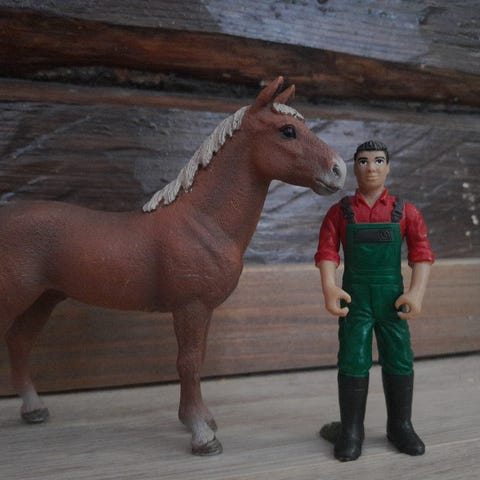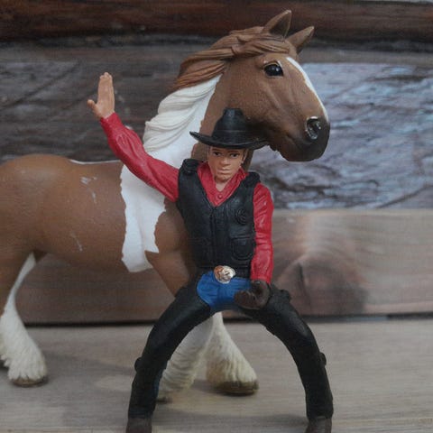 Schleich hevonen ja ratsastajahahmo, lelufiguurit. Settiin kuuluu ruskea hevonen mustalla harjalla ja hännällä sekä erillinen cowboy-tyylinen ratsastajahahmo, jolla on hattu, paita, farkut ja saappaat. Hahmot on tarkoitettu leikkeihin ja kokoelmakäyttöön. Soveltuu esimerkiksi maatila- ja hevosteemaisiin leikkeihin sekä muiden Schleich-figuurien kanssa yhdisteltäväksi. Hevosella jalat hieman vääntyneet.