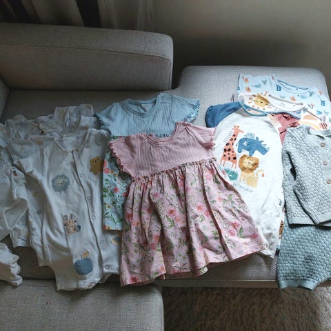 Verkkahousut x2, trikoohousut x2, pitkähihainen paita x3, trikoomekko x3, lyhythihainen yöhaalari x2, neule, fleecetakki, balettiasu, sukat.