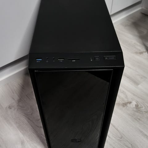 Tietokoneen sisällä näkyy emolevy, jäähdytys, useita liitäntöjä ja laajennuspaikkoja. Musta kotelo, useita USB- ja ääniliitäntöjä takapaneelissa.