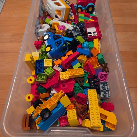 Lego Duplo rakennuspalikkasetti, jossa on useita erivärisiä palikoita, eläinhahmoja, ihmisiä ja ajoneuvoja. Vain nouto!