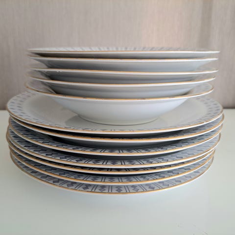 Tarjoiluvati 26cm 5kpl ruokalautasia 24cm , 5 kpl syviä lautasia 20cm, 1kpl tarjoiluvati 20cm, 1kpl pullalautanen 18cm kermakko ja kastikekulho.