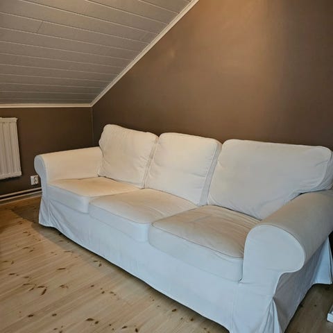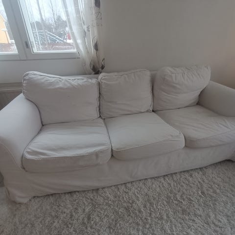 IKEA sohva harmailla kankailla. Kolmen istuttava sohva, jossa irrotettavat istuin- ja selkätyynyt. Verhoilumateriaali on helppo vaihtaa, Ikeasta saatavilla eri värisiä vaihtoehtoja. Täysin ehjä ja ryhdikäs. Vain nouto Järvenpäästä, mahtuu hissiin, omat kantajat mukaan. Mitat löytyy Ikean sivuilta.