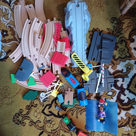 BRIO puinen junarata. Korissa useita puisia ratapaloja ja osia, joista voi koota erilaisia ratalinjoja.
