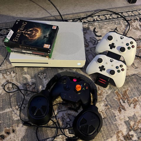 Microsoft Xbox One S konsoli. Ohjaimen vasen tatti hieman reistailee. Mukaan virtapiuha, HDMI -piuha ja kaksi peliä.
