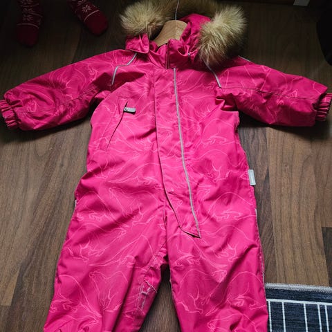 Reiman hyväkuntoinen, lämmin toppahaalari, koko 80. Värihaalistumaa haarasaumassa, samoin pepun kohdalla. Pieniä kulumisen merkkejä resoreissa.