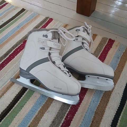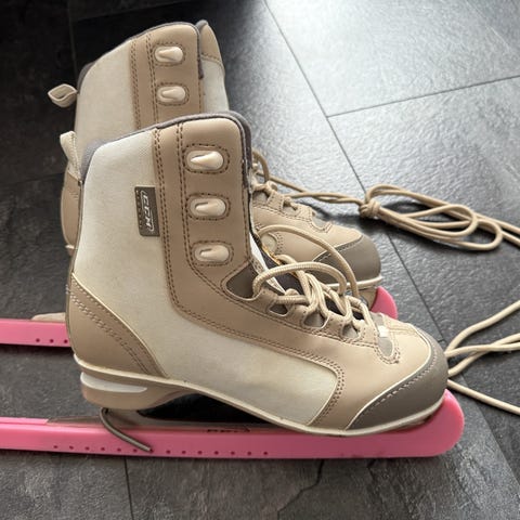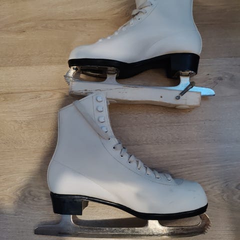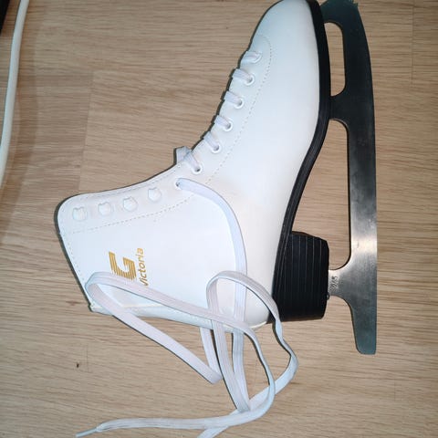 Nopsa taitoluistin luistimet, koko 39. Valkoiset nauhalliset luistimet, joissa korkea varsi ja musta korko. Ammattiluisteluun, on pieni hankauma