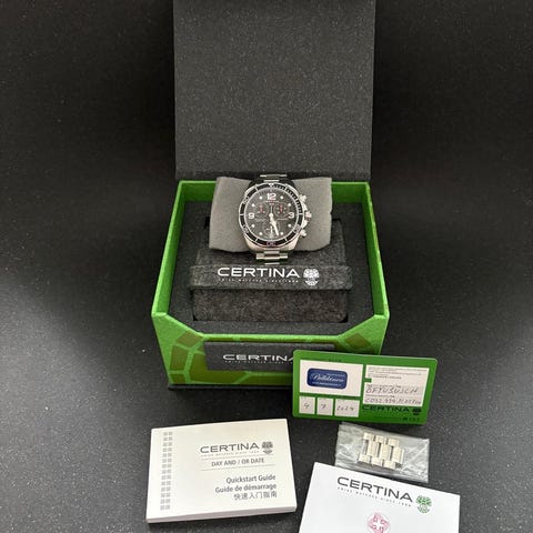 Kellossa on musta taulu, erilliset pikkutaulut ajanottoa varten sekä punainen sekuntiosoitin. Kuori ja ranneke ovat ruostumatonta terästä, ranneke orkkis oma certinan ranneke taittosoljella.