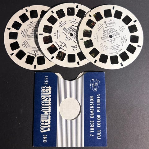 View-Master Tarzan of the Apes -kuvakiekot. Pakkaus sisältää kolme View-Master-kiekkoa, joissa on kolmiulotteisia kuvia Tarzan of the Apes -tarinasta. Mukana alkuperäinen kotelo ja paperinen sisältöluettelo. Tarkoitettu käytettäväksi View-Master-katselulaitteen kanssa. Siistit kiekot, ei kuplintaa, puuttuvia ruutuja yms. Nouto Tampereelta tai postitus 2,75€.