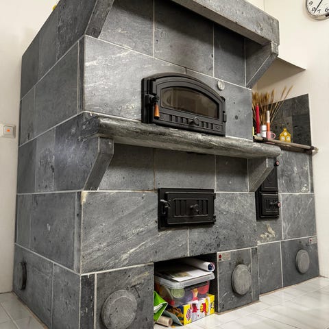 Tulikivi, vuolukivinen leivinuuni ja takka. Harmaasta vuolukivestä valmistettu. Soveltuu tilan lämmitykseen ja ruoanlaittoon. Uuni on purettuna varastossa. Uunin mitat perustuksistaan ovat: Leveys 0n 106cm ja syvyys 84cm. Purkukuvia kohteesta on ja kivet on numeroitu.