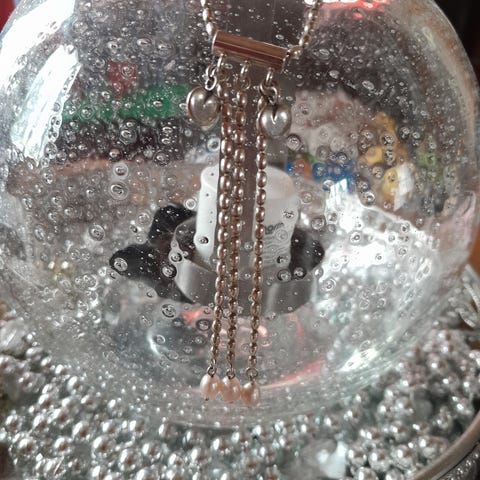 Kalevalan hopeinen Lähde -kaulakoru. Yleisilme siisti. Yhdessä kohtaa riipuksessa pieni kulumakohta (kuva 5). Ketjussa pieni painauma (kuva 6).
