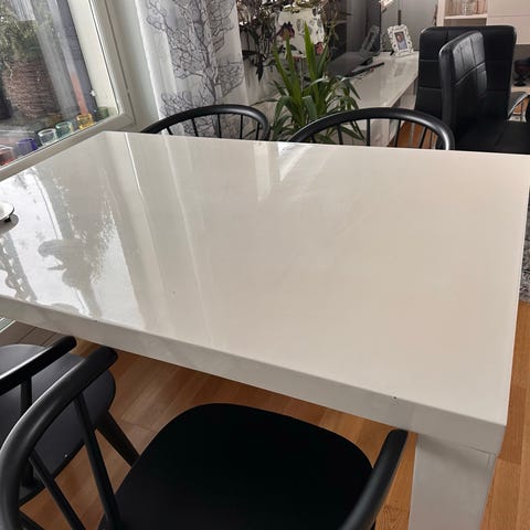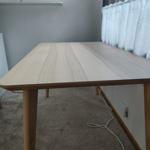 Ruokapöytä keittiöön tai työpöydäksi. Tammen värinen puukuviointi. Jämerä pöytä on uutta vastaavassa kunnossa. Nouto Himokselta. (Pöytä tuli mökin mukana ja on todennäköisesti Ikeasta.)