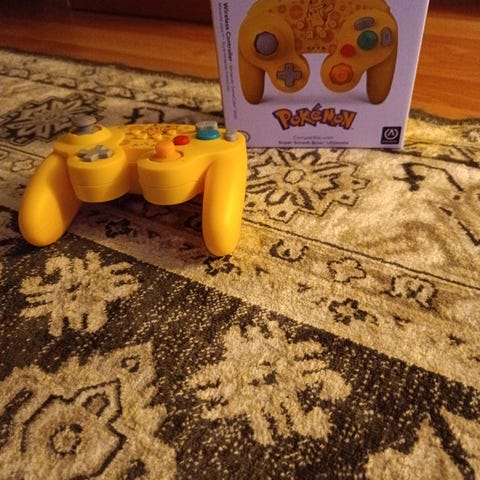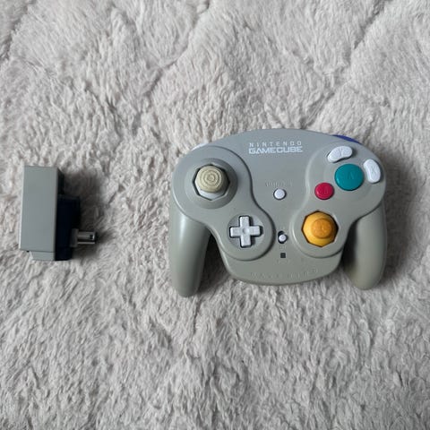 Nintendo WaveBird GameCube -langaton ohjain harmaana. Paketissa on langaton ohjain, vastaanotin ja alkuperäinen paketti. Toimii, mutta käytön jälkiä löytyy niin ohjaimesta kuin paketistakin.