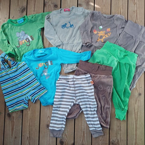 Poika vauvalla ollut käytössä. Kaikki vaatteet ehjiä, pois lukien painatukset, joissa kulumaa. Puhtaita, ei mainittavia tahroja.